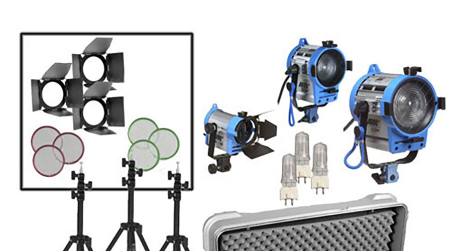 Kit includes: 650 Plus Light, 300 Plus Light, 150 Plus Light, Barn doors (3), Tripods (3), Set of gloves, Gels/Filters, Clothespins, Mafer clamp, AC adapter.