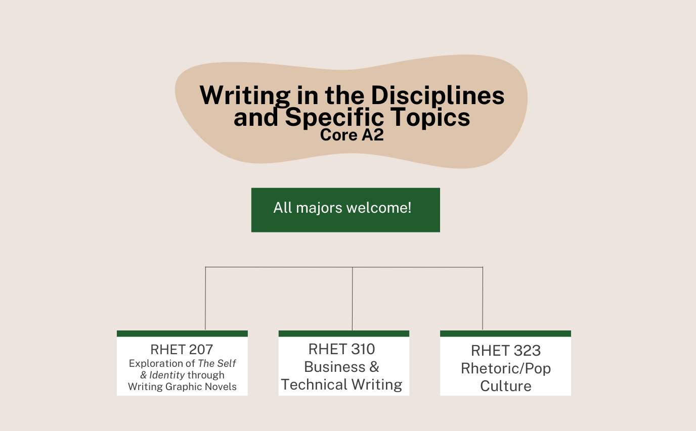 Our department has courses specially designed for transfer students who do not have Core A2 credit from coursework at another institution. Depending on transfer students' DSP results, they may start their rhetoric courses at RHET 106 or RHET 110, or they can go directly into a core A2 course.