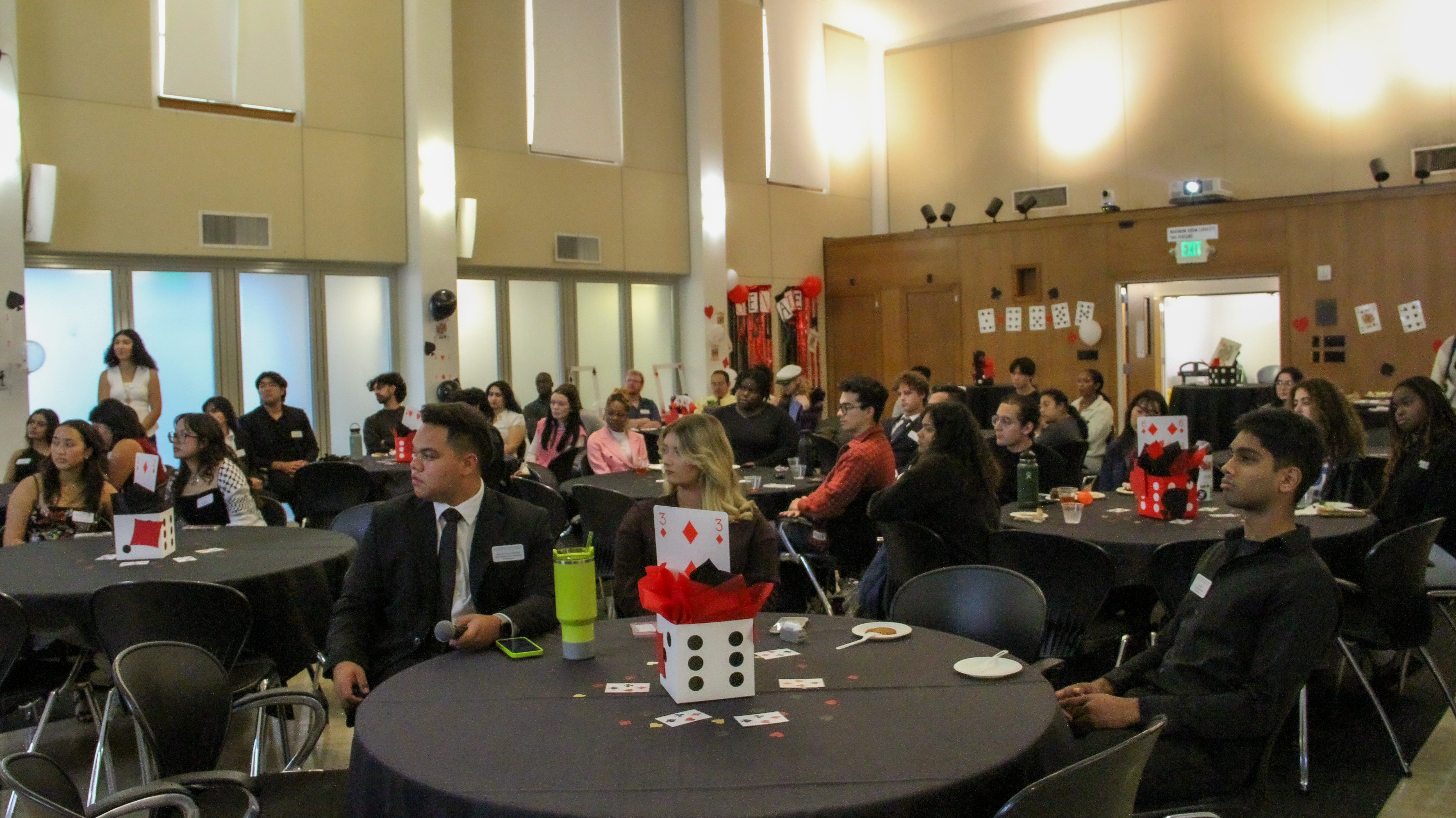 Photo of open doors of Xavier hall in Fromm Hall. Inside are students mingling at one of the ASUSF Senates' town halls.