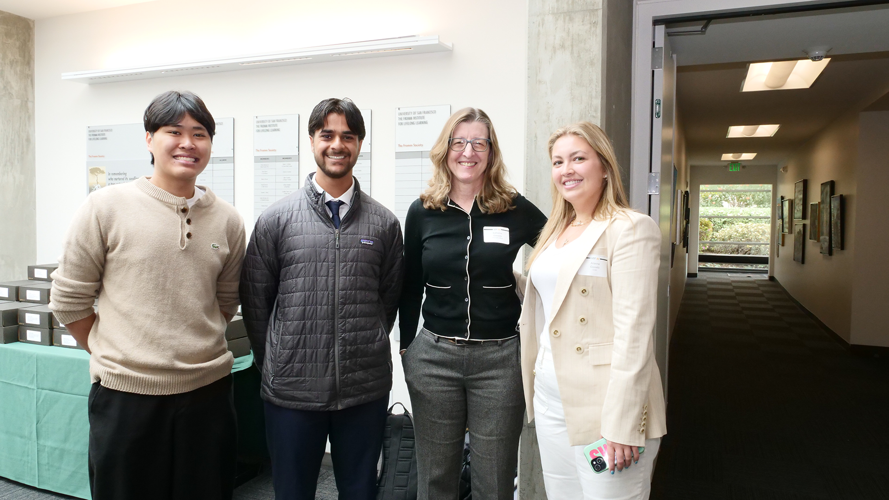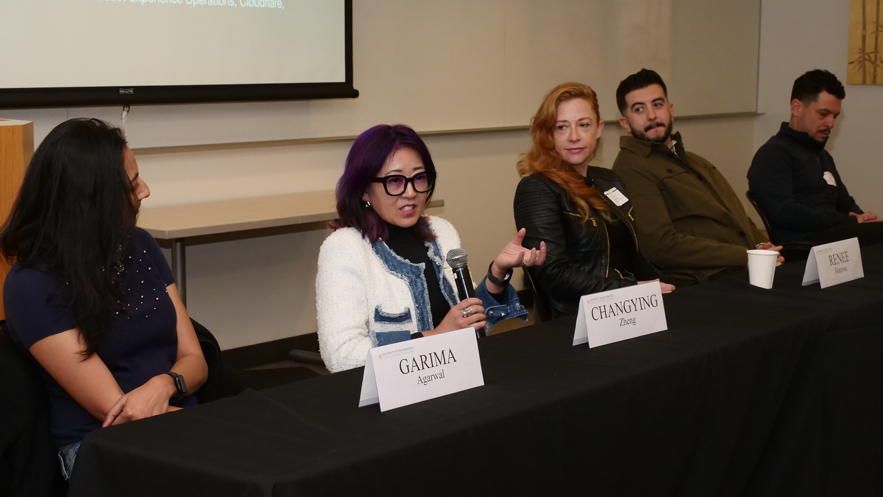 Garima Agarwal, Chief Technology Officer, Meeru AI; Renee Franzwa, Co-Founder, Catalyzed AI; Adrian Hunter, Head of Ecosystem, Fiat Growth; Valerio Mirarchi, Innovation Manager/Fellow in Residence @ Entrepreneurship For All Initiative, University of San Francisco; Emre Okcular, Solutions Architect, OpenAI; Changying Zheng (Z), Head of Product Experience Operations, Cloudflare, with Mary Bussi, Interim Associate Vice President, & Development & Senior Director, Corporate and Foundation Relations, moderator