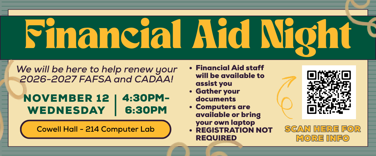 It's time to renew your FAFSA or CADAA application for the 2026-2027 academic year! Are you looking for additional help or support in completing your application? Join us for Financial Aid Night on Wednesday, November 12 from 4:30 p.m. to 6:30 p.m. in Cowell Hall- 214. Financial aid staff will be available to assist you with your application and answer any questions you and your family may have. You're welcome to bring your own device or use one of our computers to complete your application. No registration is required. But, you may complete this form to let us know you are coming. We look forward to seeing you there.