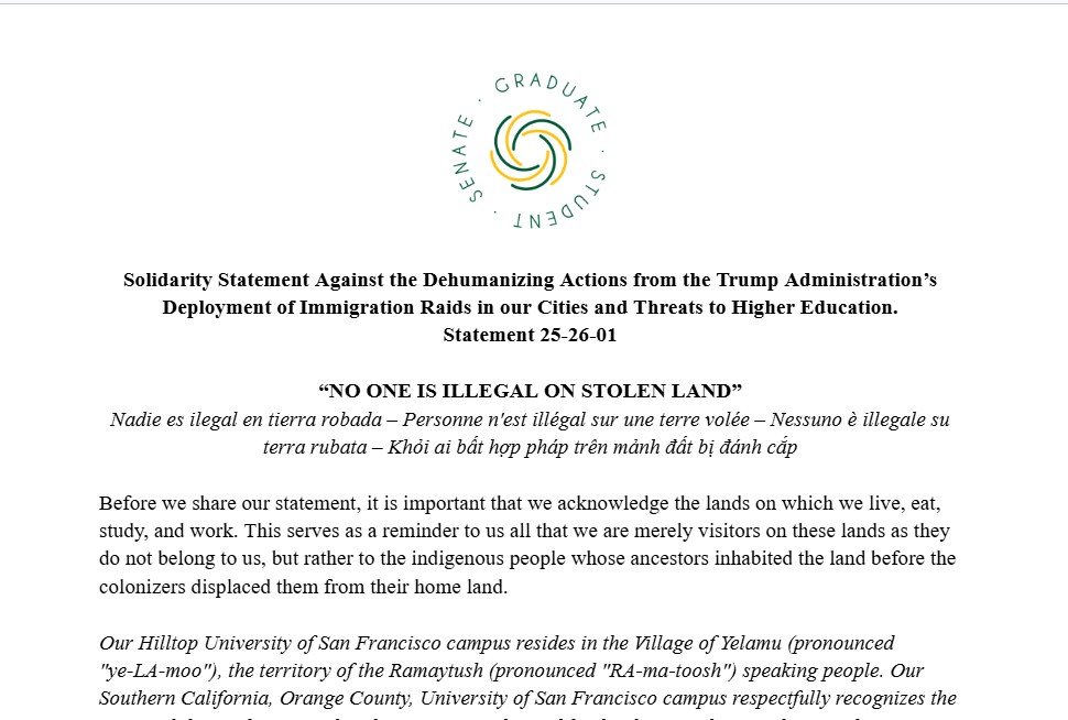 The Graduate Student Senate will represent, lead, and unify the Associated Graduate Students of the University of San Francisco to achieve holistic personal and professional development. The Senate commits to advocating to administration of the University and serving as the student body voice in order to promote positive change in policy, programs, and services. We uphold the University's mission and respect the Jesuit values.