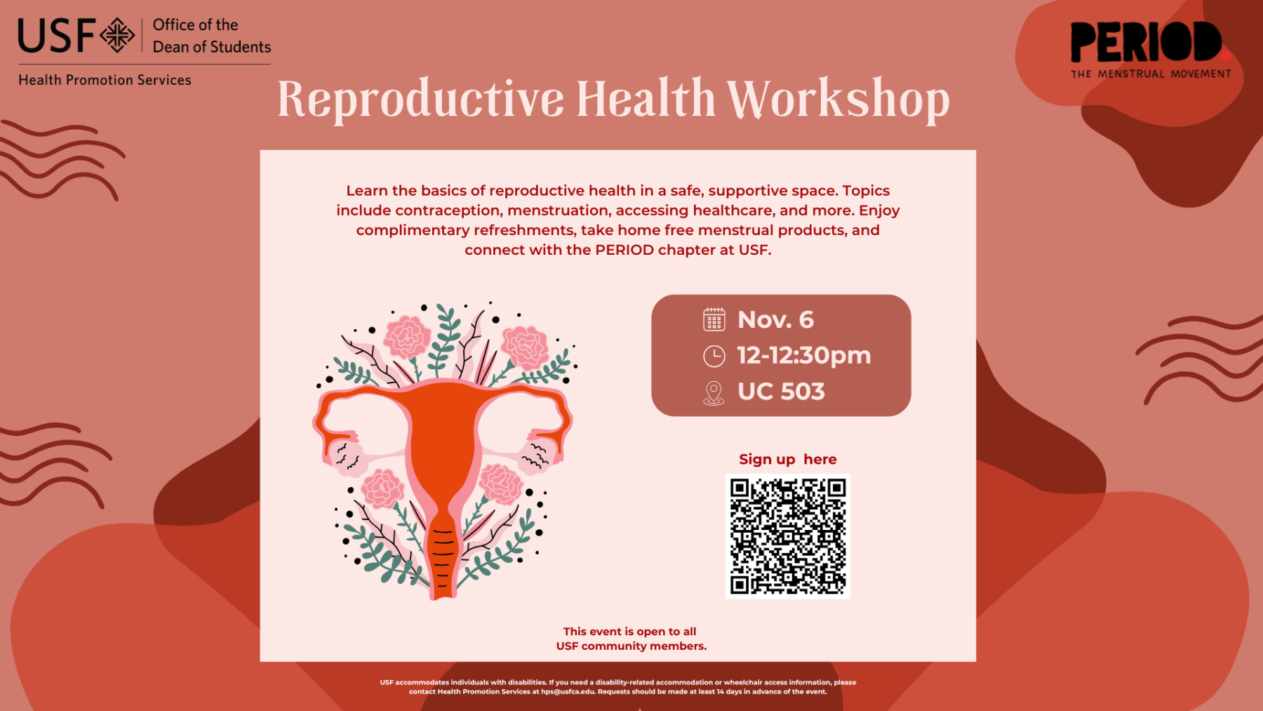 - Learn the basics of reproductive health in a safe, supportive space. Topics include contraception, menstruation, accessing healthcare, and more. Funded by the USF Entrepreneur and Innovation Initiative. Free refreshments sponsored by the PERIOD. chapter @ USF.
