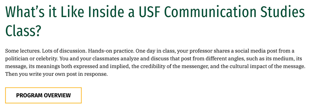 In the green box on the left, pitch your program to the reader. Introduce the colored boxes to the right of the green box. If you wish, feel free to adopt this introduction as your own: "USF __[name of program]___________ offers you energy, experiences, and opportunities that you won't find anywhere else." If you adopt this sentence as your own, please talk about energy, experiences, and opportunities in the colored boxes to the right of this green box.