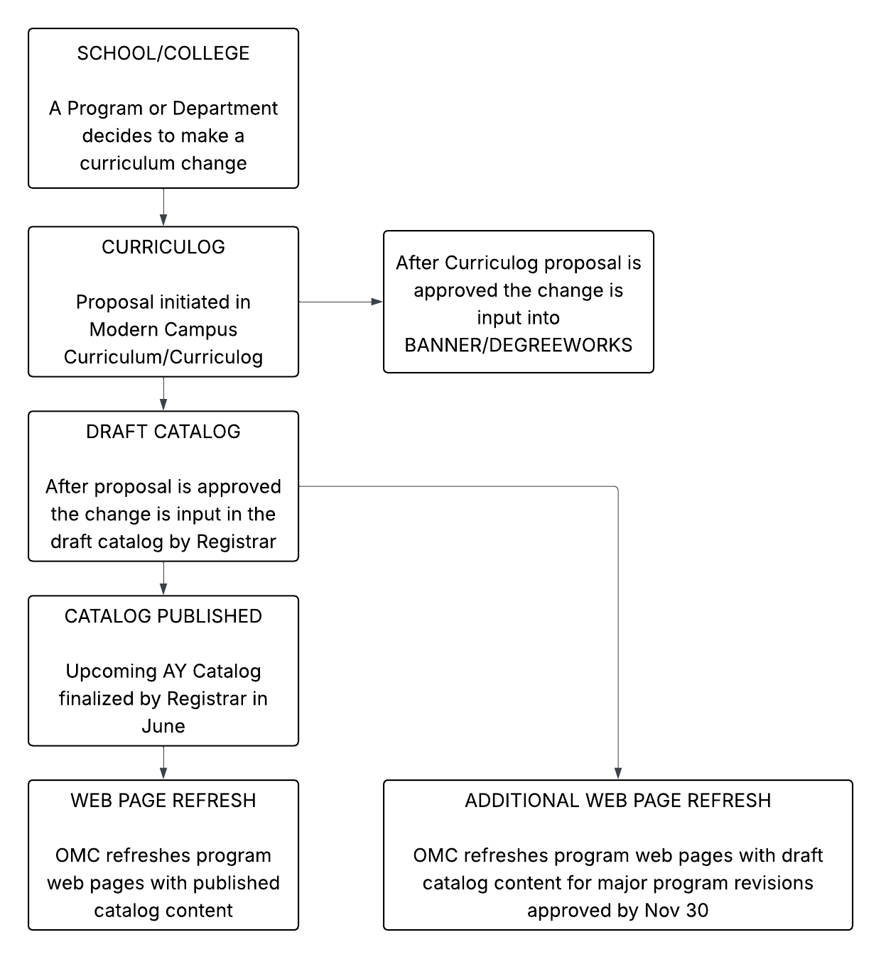 - Enter your catalog updates, including program descriptions, PLO’s, and program course requirements into the Modern Campus curriculum system (formerly known as Curriculog) and have the updates approved by November 30th.
