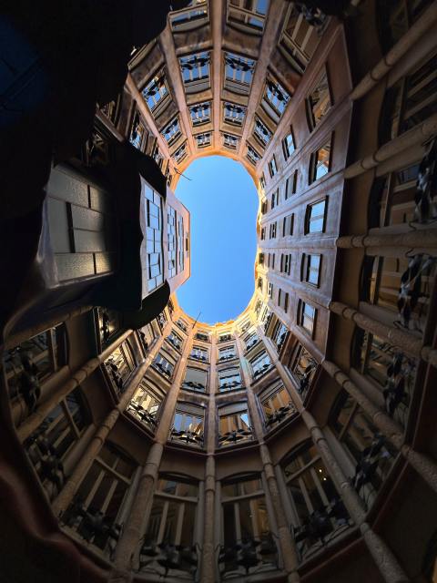 We are many shapes rising toward the same sky./I took this photo standing at the center of the courtyard in Casa Milà, Gaudí’s “living sculpture” in Barcelona. As the walls curved upward, they framed a shared opening to the sky — a reminder that people from different homes, cultures, and paths all look up to the same light. In this moment, I felt how architecture can express harmony- forms that are different, yet designed to belong together.