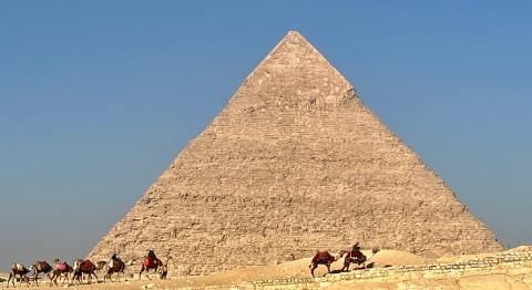 Great Pyramid in Cairo, Egypt set behind several camels and men riding them.
