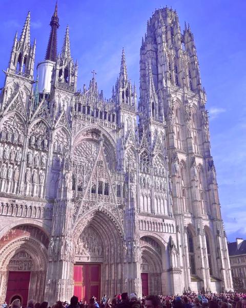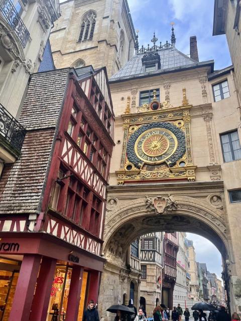 While heading to the site of Joan of Arc's execution to learn about her in history class, I passed the Renaissance-style Gros-Horloge. Its intricate craftsmanship moved me, so I took a photo.