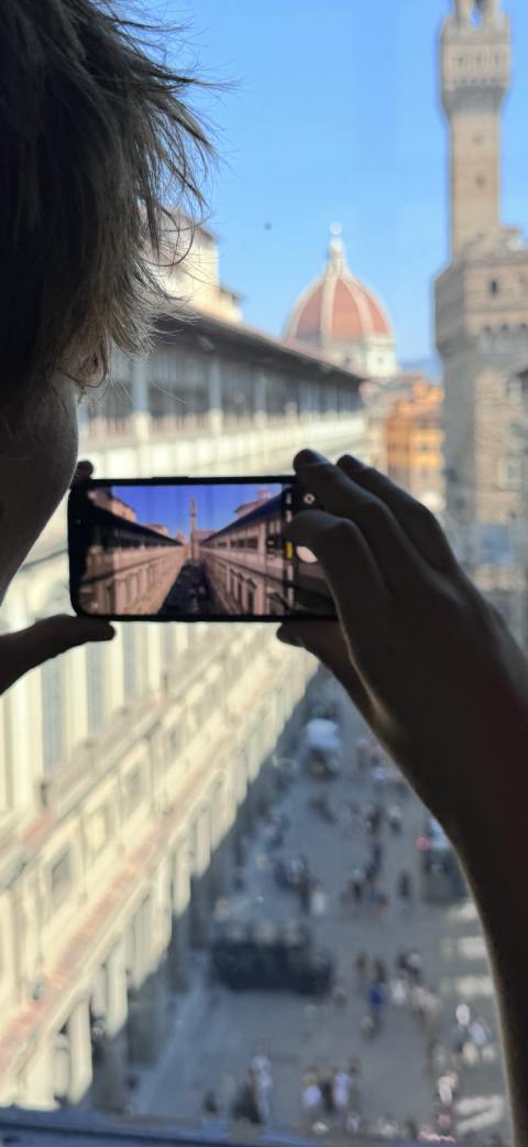 From inside the Uffizi Galleries, I took this photo of my son, Charlie, taking a photo of Giotto's Bell Tower. I loved capturing a moment of Charlie being captivated by the architecture, history and beauty of Florence.