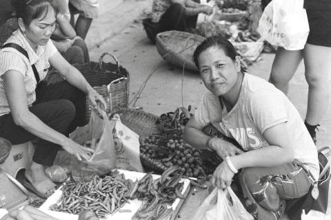 These shots were taken on black and white 35mm film when visiting China for the first time, coincidently right before the COVID-19 outbreak. I am a daughter of immigrants born in the United States so the theme of "lanterns of harmony" resonates with these feeling of dual identity creating the whole me. This photo is my mom at a local market shopping for herbs, fruit, and various produce to bring home to our family. Behind the vendor (not pictured) is a fish market and tables of other farmers selling their goods.