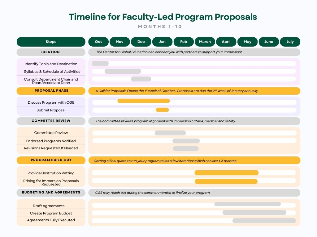 • The Center for Global Education (CGE), in partnership with the office of the Vice Provost, Global Education, Immersions and Strategic Initiatives (GEISI) and the Faculty Advisory Board on Internationalization (FABI) reviews proposals and secures written Department Chair and Dean approval to offer approved programs.